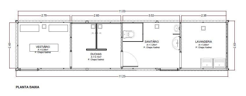 Dimensões Internas: Comprimento: 11,00m x Largura: 2,40m x Altura: 3,00m